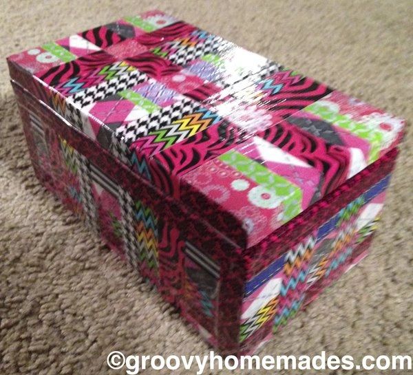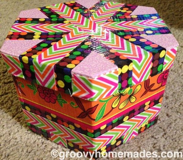 Looking for groovy storage or an unusual gift box? This funky cardboard accent fits the bill. Overall dimensions for this groovy duct-taped accent: 10” x 5.5” x 3”.