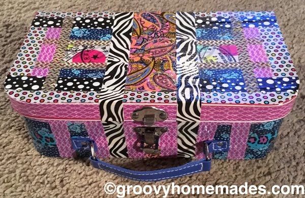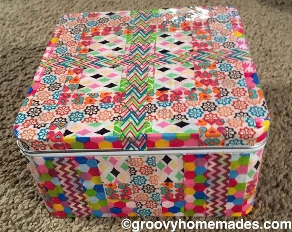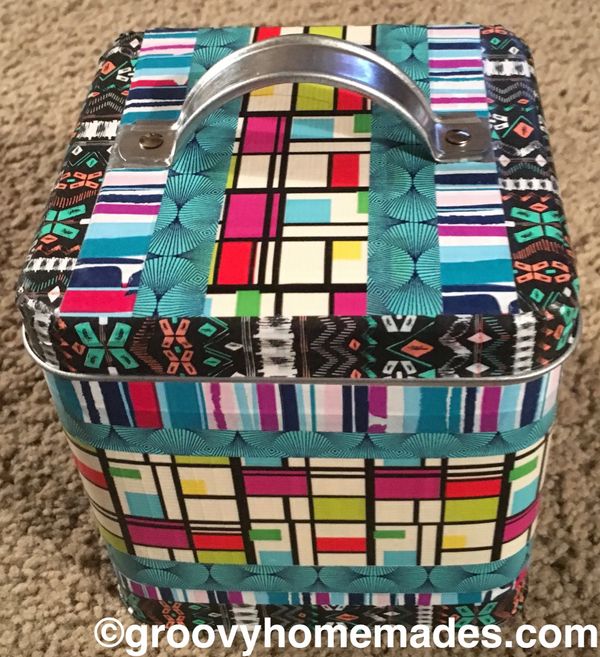 This repurposed IKEA tin became a funky Groovy Homemades accent. Use for vibrant, creative storage or place something special inside and give two gifts in one. Overall dimensions for this repurposed tin: 6.58” x 6.58” x 3.5”.